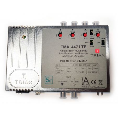 The TMA 447 LTE 5G is a multiband amplifier for small TV and Radio signal distribution networks. Compatible for analog and digital signals. It has four RF inputs (BI + FM; BIII + DAB; UHF1 and UHF2) and 1 output with separate amplification.