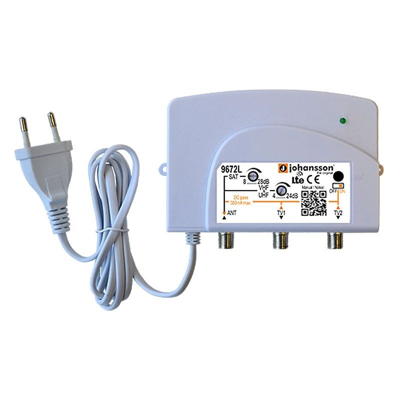 User amplifier (TER - SAT) 2 Johansson outputs. 1 input - 2 outputs. Frequency: 47… 790MHz / 950… 2150MHz. Gain: 24dB (TER) / 28dB (SAT)