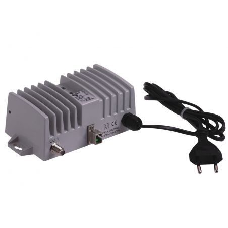 Easy configuration - potentiometer (823), or universal JXP modules (823/923), built-in CAG, indication of optical input power through 3 levels of LED. High output level (110 dBμV - 42 CENELEC channels), very low power consumption & lt; 5.5W, 3 types of surge protection, Switching power supply (180-253 VAC), cast iron housing.
