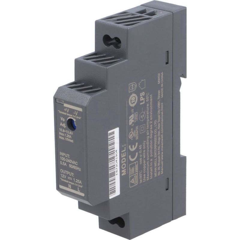 Alimentador estabilizado 12 Vc.c./1,25A. Tensión de alimentación 85 ~ 264V.c.a. Instalación en carril DIN. Dimensiones: 17,5(An)x90(Al)x58,4(P)mm.