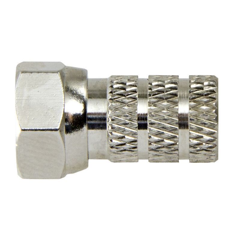 Conector F con sistema de montaje mediante roscado. Se suministra en caja profesional de plástico de 50 uds.