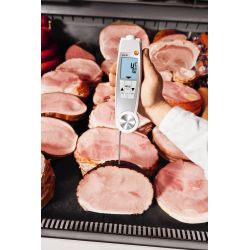 El termómetro infrarrojo para alimentos testo 104-IR es ideal para el control de la temperatura en el sector alimentario. Su tamaño permite llevarlo en cualquier bolsillo y está siempre a mano a la entrada de la mercancía, durante el transporte o la ronda de control en el supermercado.