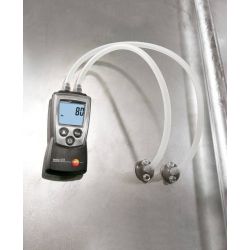 Medición de la presión diferencial en calderas de gas o en filtros de los sistemas de climatización así como medición de velocidad en el canal de ventilación por medio de un tubo de Pitot: el compacto manómetro diferencial testo 510 incluye un tubo de conexión de silicona y otros accesorios de gran utilidad para el mantenimiento e instalación de los sistemas en el sector de la calefacción y la climatización.