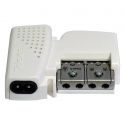 Fuente para vivienda de 12V (220mA), que envía alimentación a través del cable coaxial de entrada, permitiendo a su vez el paso de la señal de TV. Se intercala en la instalación para alimentar amplificadores de mástil o un sistema BOSS. Es compatible con amplificadores con mezcla de satélite (FImix), pues detecta automáticamente en su salida la existencia de una señal de gestión del LNB (tensión y tono) generada por un receptor, y la deja pasar hacia su entrada.