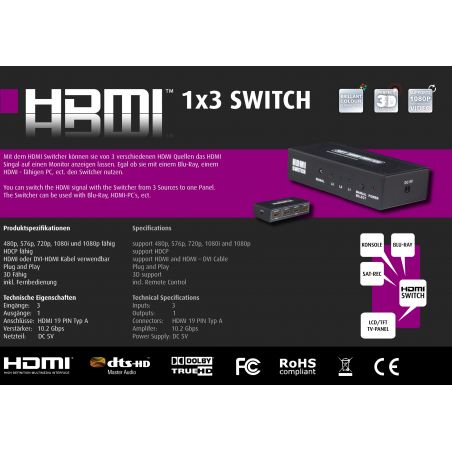 SWITCH HDMI 3x1. 3 entradas / 1 salida con mando a distancia. Para conectar 3 dispositivos de alta definición a una salida (TV).