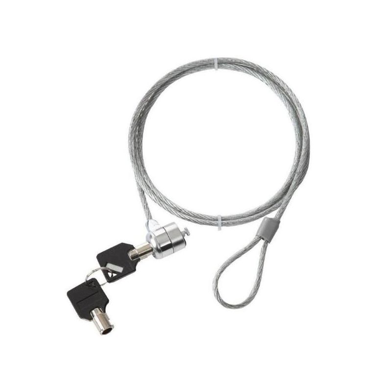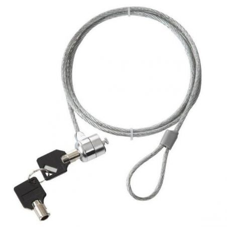 Sistema antirrobo para el ordenador portátil que utiliza la ranura de seguridad estándar que se encuentra en la mayoría de portátiles. Candado con llave (2 llaves incluidas). Sistema de Cierre Candado con llave. Número Unidades Protegibles 1. Longitud Cable 150 cm. Diámetro Cable 4 mm. Material Acero zincado. Color cable Gris. Universal Si