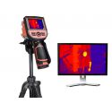 Cámara para medir temperatura en seres humanos que se puede utilizar cogida de la mano o montada sobre un trípode y conectada a un monitor en un puesto de control de accesos.