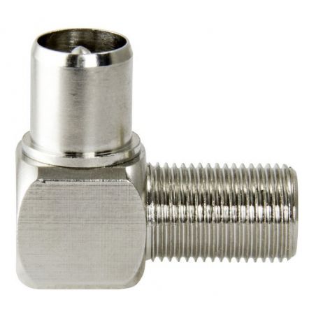 Adaptateur coudé, qui permet de transformer un connecteur "F" femelle en "CEI" mâle, typiquement pour changer le type du connecteur d'un prolongateur coaxial. Livré en boîter plastique professionnel de 50 unités.