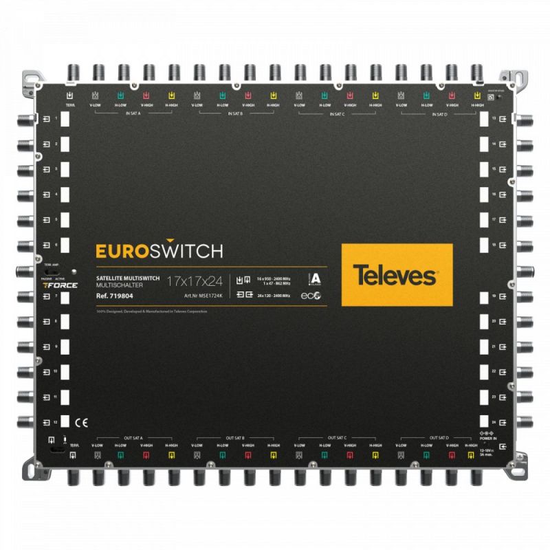 Multiswitch compact de 17 entrées (une terrestre et 16 pour les quatre polarités de quatre satellites) et 24 sorties utilisateur.