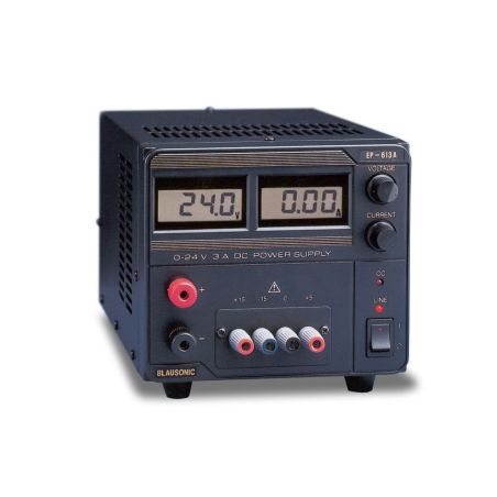 A fonte de alimentação EP-613 fornece uma tensão de saída variável entre 0 e 24 V, com uma corrente de até 3 A. Nestas fontes de alimentação, a saída variável e três tensões fixas foram agrupadas (+15 V, -15V e +5 V) para eliminar o incômodo de usar várias fontes de alimentação para o design ou reparo de equipamentos eletrônicos. O valor das tensões fixas foi escolhido para permitir a alimentação simultânea de circuitos lógicos e analógicos. Portanto, sua aplicação é especialmente indicada em laboratórios, oficinas de manutenção e em escolas.