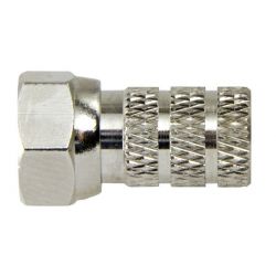 Conector F com sistema de montagem rosqueado. Fornecido em uma caixa plástica profissional de 50 unidades.
